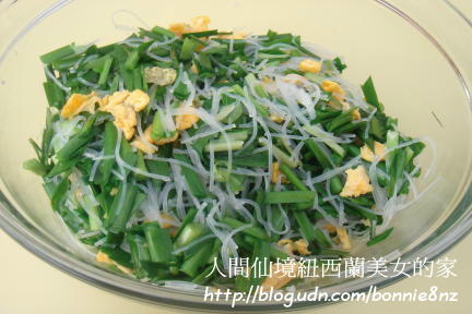 用熱水將粉絲燙開,撈出瀝乾水份,切小段。