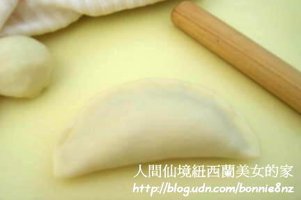 麵糰分成9等份,擀成圓片,包上餡料對摺,封口捏緊成餃子狀。