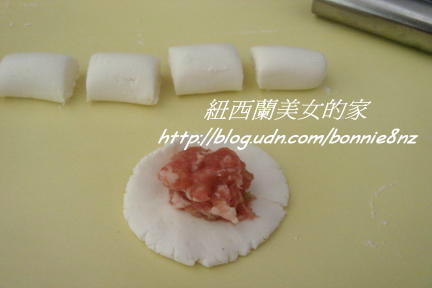 粉糰分小段,壓成圓薄片包入餡料,搓成圓形。