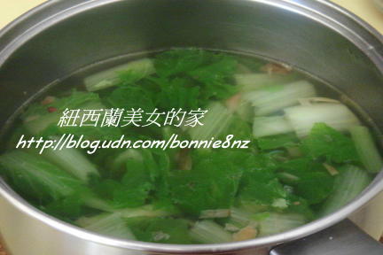 煮鍋滾水,加入紅蔥酥、茼蒿菜,再煮滾加入調味料。