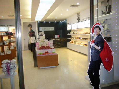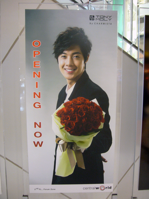 1月9日第一天逛曼谷的商場Central Wolrd,踏進門口已看到小賢的TonyMoly海報,好驚訝, 手拿玫瑰花的小賢, 笑容很甜呵, 然後和朋友在商場轉了幾個圈, 問了很多人才找到這家TM店, 離遠已看到穿聖誕裝小賢站在門口歡迎我們了, 這家TM店真的很大, 比香港及桃園的大很多呵,我們進門口就拍照片, 店內滿是小賢的照片, 其中一張黑白的側面照我最喜歡呵, 店員就拿小賢的海報來誘惑我, 買滿500泰幣就送一張, 結果送了2張海報, 一張是聖誕帽的, 另一張是玫瑰花的:)還送了很多samples, 買完東西在門口遇到來自星加坡及泰國的TS,她們也是改不了機票酒店, 結果也來了泰國渡假了:)