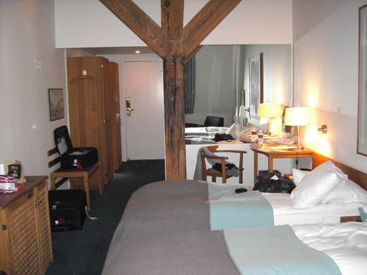 "不然, 我先給您一間單人房好了! 不過我們的單人房真的很小, 怕您會住得不舒服...您可以先睡一下, 晚點再幫您換間大房間." 櫃檯高頭大馬的年輕丹麥小夥子很有禮貌地跟我說, 恩!服務態度很好, 加分....這麼想就太早啦! 因為接下來我站在LOBBY等待飯店人員來將我的行李送上七樓卻毫無動靜....呵呵! 在人魚國即便是四星級飯店也沒有這樣的服務的, 因為人工實在太貴...我只好自己拉著兩件加起來近三十公斤的行李上樓.
