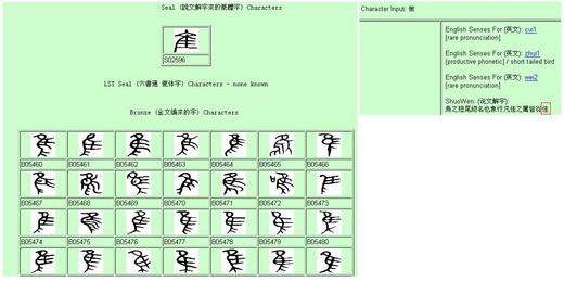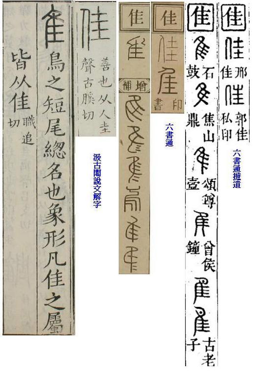 篆文與說文同,但六書通的篆文,大部份都與佳的形不符,好像是隹(誰右半部)字.