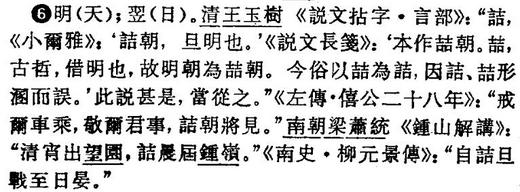 1. 明朝、翌晨。北史˙卷五十二˙齊宗室諸王傳下˙武成諸子傳:「伏連信之,伏五十人於神獸門外,詰旦,執士開送御史。儼使馮永洛就臺斬之」。或作「詰朝」、「詰晨」。http://140.111.34.46/cgi-bin/dict/GetContent.cgi?Database=dict&DocNum=80841&GraphicWord=yes&QueryString=%E8%A9%B0%E6%97%A6$ 教育部國語辭典