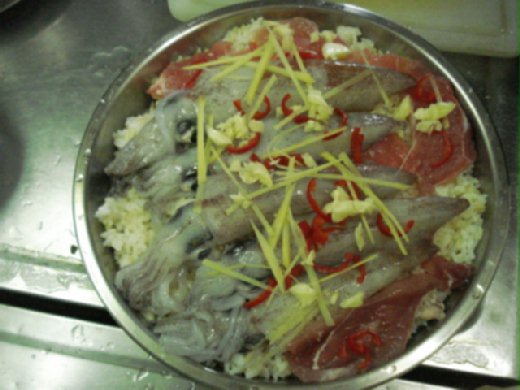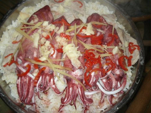 一、白飯先煮熟,盛入電鍋蒸盤;上面鋪上鮮活小管,旁邊在鋪上肉片。