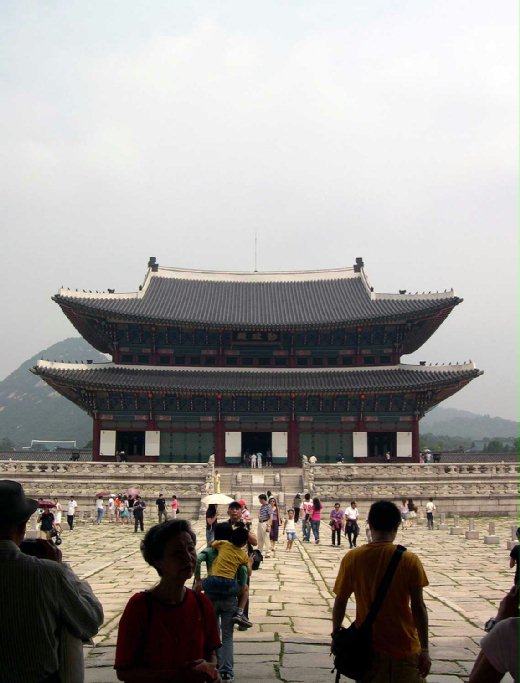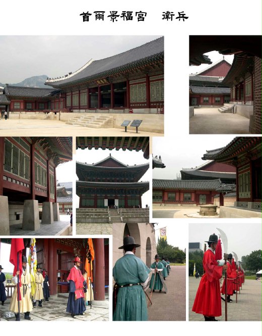 八月二十三日晨,我們與公會同仁一起參觀位於首爾城北的景福宮。其規模較紫禁城小,但森然略同。此皇宮係由朝鮮太宗建於1405年,但後來陸續增建和修復。當年朝鮮係受中國冊封,故各種建制均需比中國降一級;例如中國龍有五爪,彼僅四爪;中國屋脊上走獸有九,彼僅有八;中國皇帝穿黃袍,彼則穿藍袍等等。我聽導遊行言至此,欣然堪慰,原先在國內之悶氣幾乎一掃而空。但想到我等皆來自台灣,又有什麼條件去欣然、去堪慰?