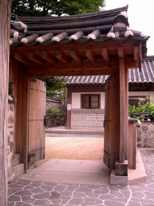 韓國的舊時房舍與從前的日式平房有些類似之處,例如日屋有窗台、韓屋有更寬敞的木製平台,都有把室內空間向外延伸的意味;這種做法,屋內比較不嫌擁擠,所以二、三十坪的房子,再加上庭院和圍牆,就很可以安身立命。日屋用榻榻米、韓屋則為木地板,地板上再放置桌、檯、床等(但都離地較近),這又近於中國。我記得小時候在台北街旁會看到成排的舊榻榻米,都是外省人住不慣而丟棄的;在榻榻米上放桌和床當然很奇怪,可見雖是鄰國,文化和習慣差異之大,難以想見。