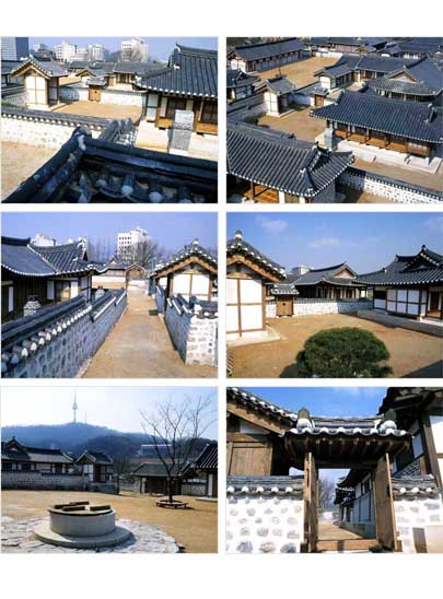 據說全韓國保存、復原了許多處老村莊,都叫韓屋村。我們公會經過比較和打聽,知道還是位於首爾的南山谷韓屋村最為精彩和完整,我們實際參觀的日期是八月廿五日。這個韓屋村是由五棟古老房舍所組成,房舍建造的年代大約是在1850~1900年之間,因都具歷史價值,而於1998年遷移或重建於此,期望能集中長期保存。五棟房舍的名稱如下: