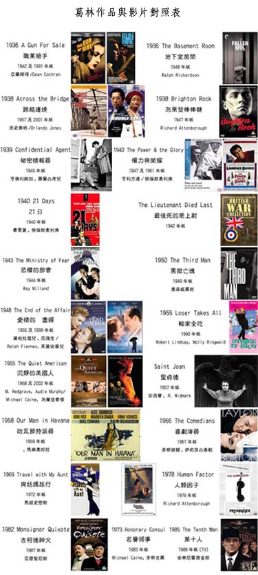 葛林成名後的第一部小說-司坦玻特快車-在出版後很快被拍成電影;之後幾乎每部小說均如此,而主演者常是當時最有名的演員。我為此特別製作了一張圖表,來說明小說與電影的對照關係(只包含現今有圖片者)。這些電影中大部份都完成於1940~1980年之間,其中最有名的一部是黑獄亡魂(The Third Man (1949)),主演者是奧森威爾斯。在1990年之後只拍了五部,而僅有愛情的盡頭The End of the Affair (1999)和沉靜的美國人The Quiet American (2002)兩部在台灣放映過,相信許多朋友都曾看過。我最喜歡的喜劇演員The Comedians (1967)則是由當年最紅的銀幕夫婦伊麗莎白泰勒和李察玻頓主演;而更早,勞倫斯奧利佛和費雯麗則演過二十一日21 Days (1940)。