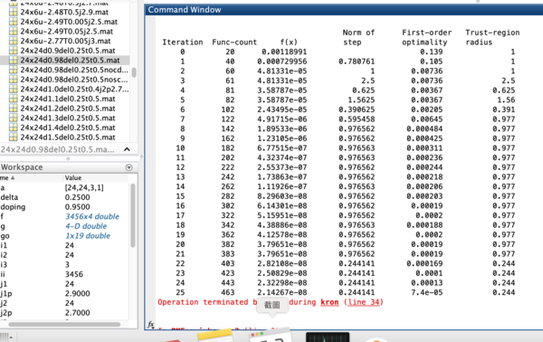 以上只是些簡單的介紹,想要理解以上必須懂量子力學(還有量子力學如何在多體系統中運用),但我真正想說的是,自從上次找到那個均勻的解後,我一直找不到CDW的解,教授叫我把週期性邊界條件放斜的,我也花了些時間做出來了,用這個方法我可以去解24x4的斜放晶格,中途也好像有看到電子密度的週期震盪,但由於它只震盪了兩次,教授並不認為那是CDW然後又叫我做Fourier轉換從實空間轉到k space去解但由於我的Hamiltonian中的一些係數和晶格位置有關所以要轉到k space並不容易(在轉k space這又花了大約三個禮拜,因為我一開始還是用斜放的方式轉到k space,但教授說我這樣做只是把問題弄得更複雜),最後我想到一個方法,那就是在實空間中直接強迫所有的變數(電子密度、超導配對等)都有週期震盪的模式,但是這樣去解我頂多只能解到15x15的晶格(程式碼的時間都花在建構Hamiltonian矩陣上),於是我又想到:既然所有的變數都有週期性那麼我的Hamiltonian也會有週期性,這樣我只要建造一個週期,其餘的部分就讓電腦把這個週期重複建構(我可以用matlab的kron函數辦到),這樣的方法大大的減少了我的程式碼花的時間,以至於我可以跑到24x24的晶格(走到這一步歷程將近4個月)。
