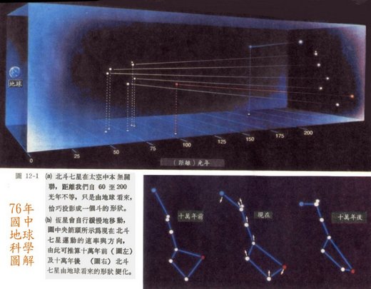 古代人不了解人類視覺的極限:〔一定距離以上的目標,人們就分不清物體誰遠誰近〕,天空上的點點繁星在人們眼中以為都是一樣遠近,卻不知道這些星座中的星體,只是觀星者為了找尋目標方便而勾勒出易於辨認的形狀而已,實際上這些星座中的星體彼此間絕大多數根本毫無關聯,而且在宇宙中的位置實在天差地遠〔如上圖之北斗七星空間示意圖,也可參考:天球與星圖中之立體示意圖〕。