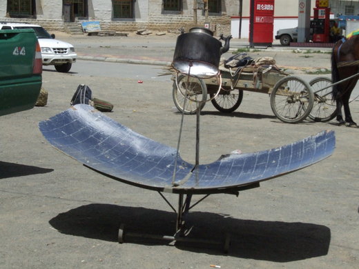 今天在tvbs新聞中看到一則新聞(2009.09.23):「用太陽來烤雞 小吃攤省錢新妙招 」,『....距離曼谷西南方90公里的這個小吃攤,香噴噴的烤雞,堪稱一絕,因為不用碳烤,用陽光,就能烤出香噴噴的雞肉。....只要利用這一大片鏡子牆,將陽光反射至烤肉架,產生的攝氏2百度熱度,就能烤熟食物,....於是打造這片鏡子牆,並且從原來的3百個鏡子,增加到1千個,烤肉更迅速。....』〔詳:原報導〕。原理和藏民的簡易太陽能煮水設施完全相同,但藏民的簡易太陽能煮水設施已經行之有年,只是沒拿來烤雞就是了!!