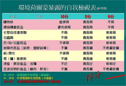 國內現在不但有便利商店在推廣所謂City Cafe〔跟星巴克外帶杯一樣:使用紙杯〕,更有不少餐飲業者使用紙製碗盤盛裝熱騰騰的餐食〔如八年得、現煮粥品....〕,而許多人更習慣用紙碗沖熱開水來吃泡麵、在超商用微波爐加熱紙餐盒或塑膠餐盒便當〔如上圖環保署環境賀爾蒙自我檢視表第九項〕,不知不覺間就吞下大量可怕的環境荷爾蒙,難怪有人喝水也會胖、不孕症犯者愈來愈多〔可參考上圖:環保署環境賀爾蒙自我檢視表〕,水質污染問題不但造成自然界有雌化滅絕危機,也提高變胖機率造成心血管疾病和糖尿病。