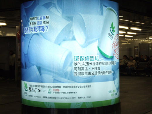 紙餐具暗藏致命危機〔塑膠餐具更不用說〕,國內民眾實在不應該等閒視之,台北車站地下一樓已經有業者張貼PLA廣告〔如下圖二〕,方便!?也許是往西天的捷徑,聰明如你可別再使用這些危險餐具與容器了
