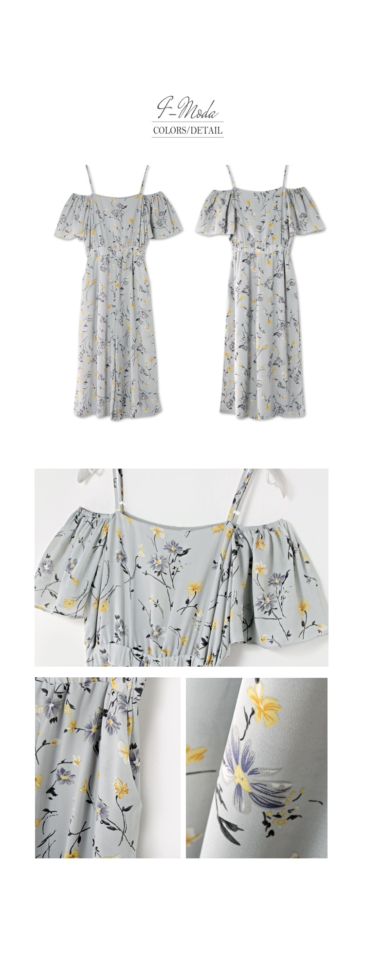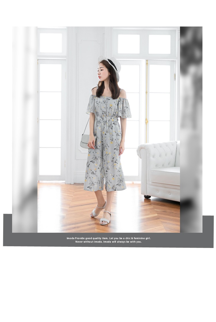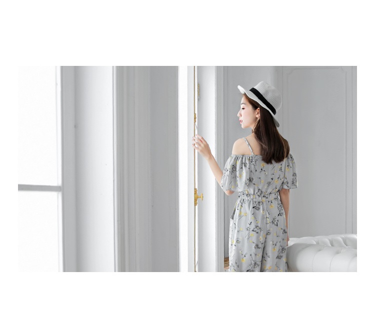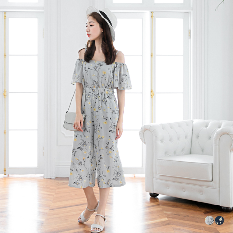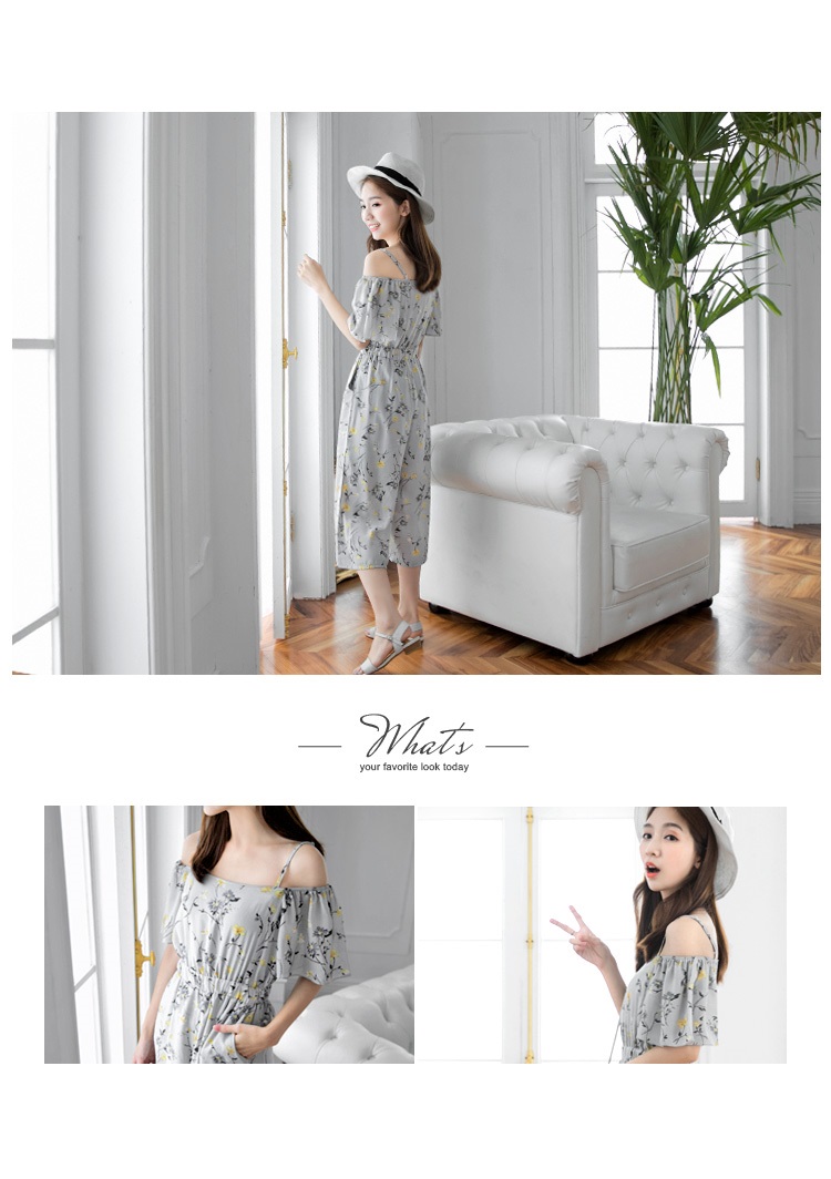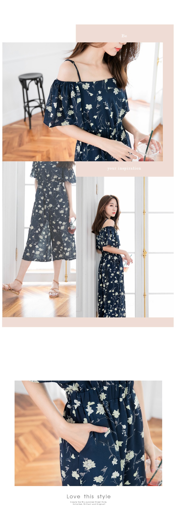 0621新品 雪紡碎花細肩帶露肩袖腰鬆緊連身七分褲.2色