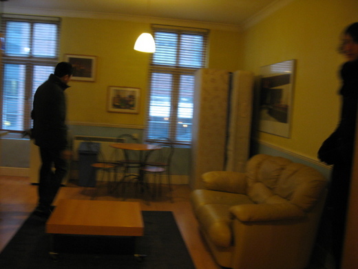 第一個地點位於一座小公園旁,那時地上還積雪,下午傍晚時分,顯得格外寧靜與安詳。但這一間老舊,樓梯又窄,搬行李很不方便,電熱水器就在床的頭上,感覺很奇怪。儘管外面景致很好,但內部空間規劃與屋況實在不好,且地點也頗遠。