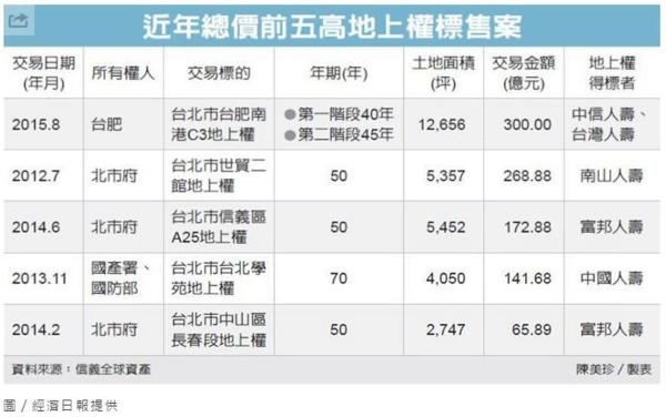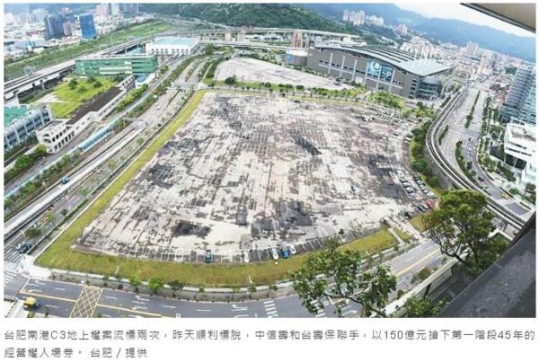 台肥南港C3地上權案昨(12)日開標,由中國信託人壽和台灣人壽兩強聯手,以150億元搶下C3案第一階段45年的經營權。兩大壽險在十年內擁有第二階段40年、150億元的優先續約權,若確定執行續約,C3案實質標售價將為85年、300億元,創下史上標脫總價最高的地上權紀錄。