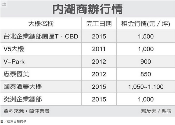 內湖科技園區挾著租金較台北市區低的優勢,辦公及廠辦的空置率持續降低,由三陽工業、美孚建設與全球人壽共同投資的內湖「台北企業總部園區T.CBD」將於第4季完工啟用,釋出大量體的辦公面積銷售及招租,有助擴大內科腹地,舒緩整體租金上揚壓力。