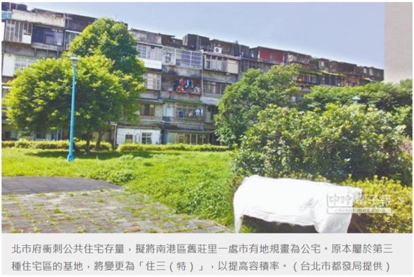 這塊位於南港區舊莊街一段3巷3弄以南、大坑街以北的空地,目前為低度利用的綠美化空間,面積2698平方公尺。因鄰近中研院、南港經貿園區、汐止科技園區,也靠胡適、舊莊國小學區,都發局規畫將原本屬於第三種住宅區的基地,變更為「住三(特)」,容積率從225%提高至337.5%,成為公共住宅。
