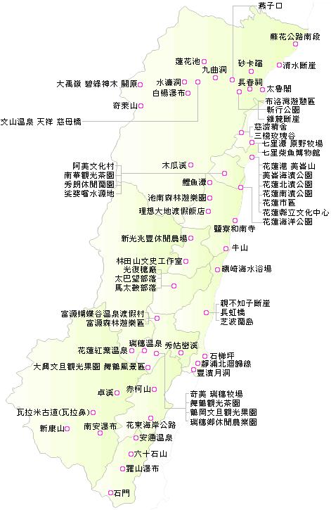 太魯閣遊客中心、七星潭、花蓮北濱自行車道、花蓮松園別館、觀光魚市鬼頭刀魚丸、文化局園區石雕季、吉安慶修院、東華大學、壽豐鄉豐田村、文史館、廣島式菸樓、碧蓮寺、鯉魚潭、鳳林鎮林田山林場、