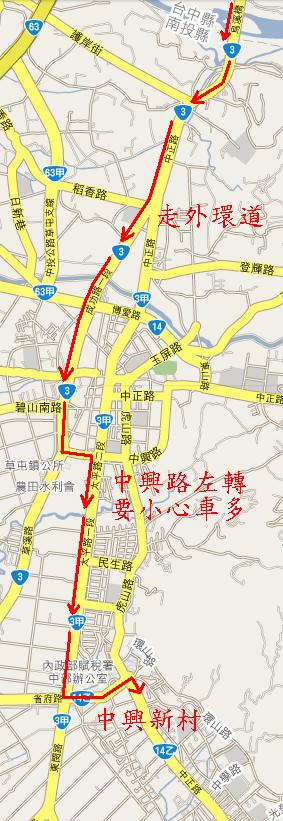 我們走的路線一樣是:溪南路一段、二段、三段走到底→右彎到北岸路→左彎一直走到烏溪橋→過橋後走台三線(外環道)→中興路口左轉→太平路口右轉→省府路口左轉就可以看到中興新村的地標、牌樓、大王椰子、荷花池、圓環、大草坪。