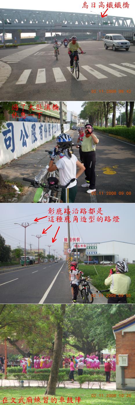 台中到鹿港,通通都是平路,從烏日中山路一段、二段、三段,騎到成功火車站,繞進萬客隆的廢墟,再繞到大肚溪橋,大肚溪橋修理施工好久好久了,還沒弄好,經過時要小心;過了橋,就到彰化了,這次還是走金馬路,不走彰化市區,市區大車小車多得要命,金馬路繞一下,還可以接受。金馬路走完接中華西路,往彰化交流道的方向走,繞過交流道,接上彰鹿路,從一段走到八段就到了!