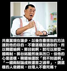 郭文貴對彭文正說「說實在話,現在要是讓你文正節目滿意的總統真誕生了,對台灣就是災難。」他說如果台灣實質獨立不用流血,他百分之百支持,但目前談台獨就像俄羅斯政治家給他的比喻,還沒登月就想直接登上太陽,是場災難,「小蔡總統可能做得不好,但她起碼不會賣台。」@@獨派「逼宮四老」痛打小英給中國看!