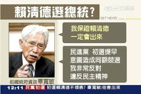 台南市長賴清德表明民進黨總統初選「不領表」,民進黨主席蔡英文可能因黨內無競爭者,不須初選就成為總統候選人,不過前總統府資政、新台灣國策智庫創辦人辜寬敏昨語出驚人表示:「我保證賴清德一定會出來!」他並批評,若民進黨提早初選時程,是意圖造成同額競選,他非常反對,因為這違反民主精神。@@辜寬敏自已出來選!不就打破蔡英文一人獨大優勢?提前一個月對賴清德有啥影響?對早想選總統的辜先生有啥影響?也不過是兩三個人想參選罷了!早決定早好。 閱:2015-01-31 http://news.ltn.com.tw/news/focus/paper/852092〔記者陳慧萍/台北報導〕