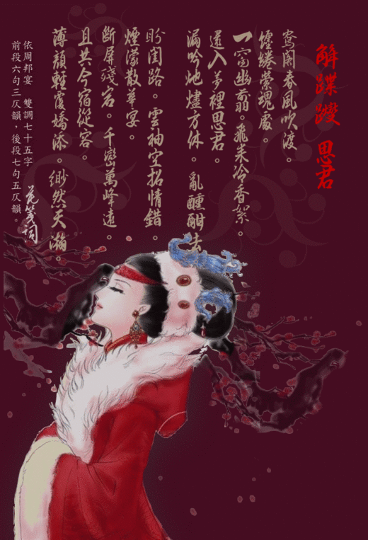 愛戀成癡心落寞。雖處秦淮夜泊。不怨恩情薄。酒中千載藏魂魄。夕照佳人紅似芍。粉臉豐腴嫩弱。琴韻傳樓閣。浪滔心事潮如昨。