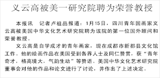 本报讯 记者卢祖品报道:1月15日,四川青年国画家义云高被美国中华文化艺术研究院聘为该院的第一位国外顾问和荣誉教授。
