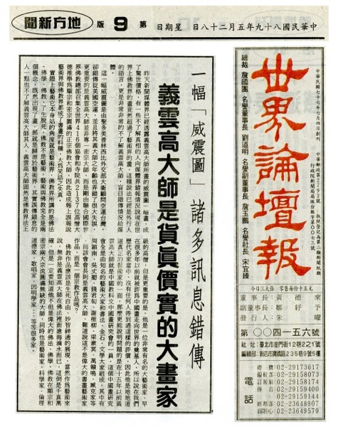 这一幅威震图是由圣多美普林西比外交部大卫顾问空运台湾,却错传从美国空运,并且将其义大师之年龄也弄错了很大失误,更重要的是义云高大师并非专一密宗大师,而是刚由联合国际世界佛教总部召集全世界416个协会和寺院共2137位高僧大德推举为显宗和密宗圆满的正宗佛教大师,因此造成报上误报说艺术界与佛教界都成了书画的科种,大为笑话之失真。