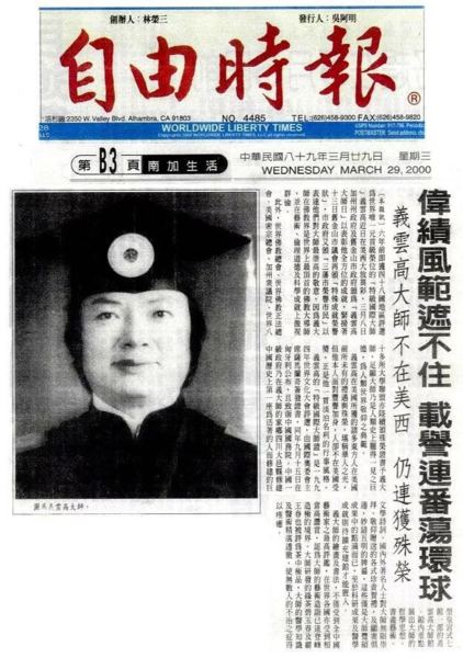 (本报讯)六年前即获四十八国地区评选为世界唯一元首级荣位的「特级国际大师」义云高近日在美西大放异彩。三月八日加州州政府及旧金山市政府颁为「义云高大师日」以表彰他全方位的成就,紧接着十三日旧金山市议会再颁「特殊成就荣誉状」,市政府又颁「三藩市荣誉市民」以表达他们对大师最崇高的敬意,因为义大师在佛教界是世界上最顶首的佛教大导师,并在艺术、伦理道德及科学成就上傲视群伦。