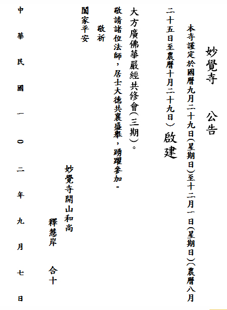 大方廣佛華嚴經共修會(三期)。 敬請諸位法師,居士大德共襄盛舉,踴躍參加。 各期行程如下: