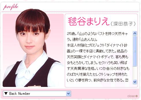 A:她人真的很美,初次見面時覺得好感動。總覺得她周遭流著的空氣好像都具有透明感一樣。正式來之前我會一起和她彩排,那時她就已經讓人覺得是個「賣場裡能幹的第一把交椅惠美前輩」了,引領著大家演下去。我覺得就是因為有可靠的伊東小姐在,我才能演好麻理惠這個天真無邪的角色。