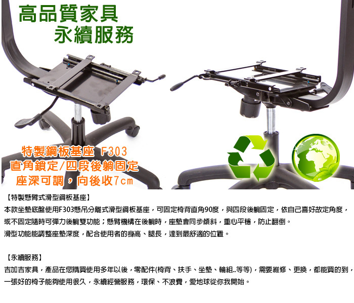 基座:椅背可固定90度、後躺四段式固定、座深調整