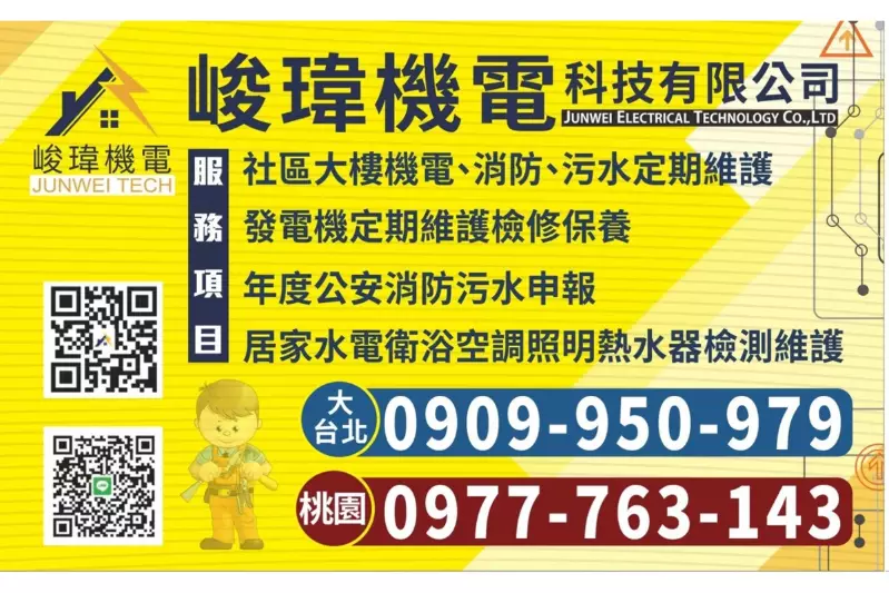 峻瑋機電科技有限公司深耕社區設備維護多年,專業服務涵蓋年度公安申報、消防申報與污水申報、發電機定期維修保養、社區大樓機電與消防系統維護、污水設備巡檢、居家水電空調與衛浴照明檢測維護等全方位項目,同時提供社區水塔清洗、ATS 檢測、冷氣保養、發電機檢測、公安與消防申報等整套整合ㄧ條龍服務。公司主要服務區域包括桃園、新竹、雙北市,以專業、安全與確實的維保流程,成為社區長期信任的設備管理夥伴。