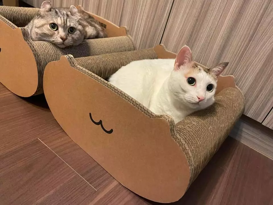 A:最初靈感來自工廠留下的紙製樣品,被收編小貓反覆磨爪、玩耍。團隊後續研究發現,瓦楞紙結構在「抓、磨、踩踏」的手感與回饋上,能吸引貓咪持續使用,因此開始投入產品化與耐用度方向的優化。