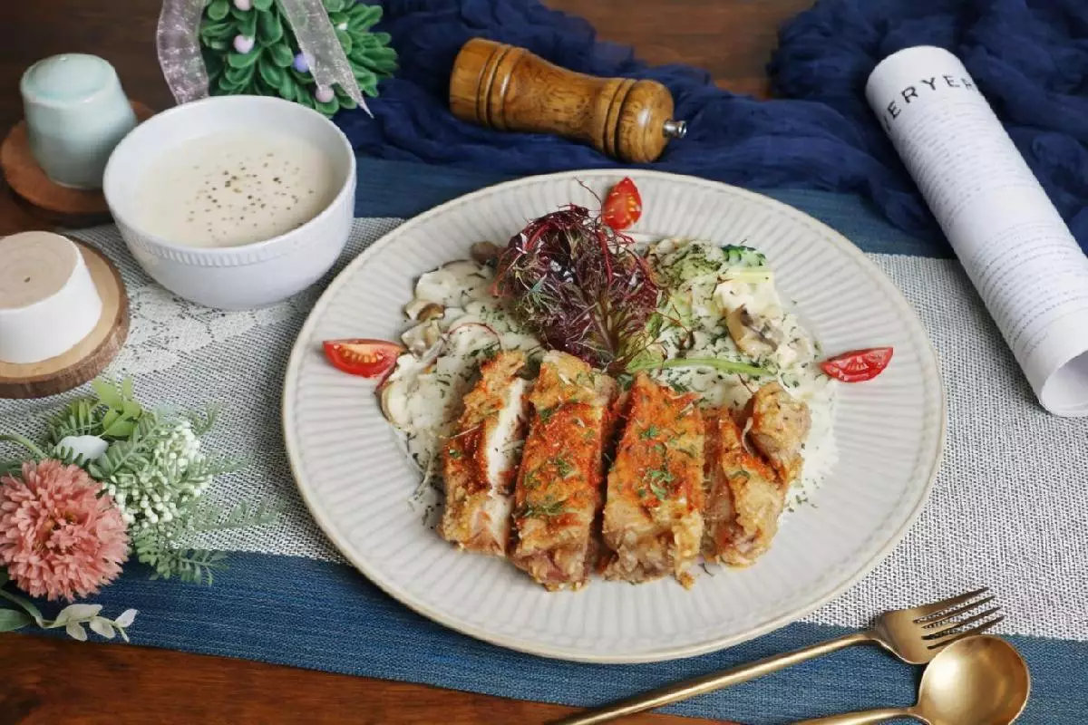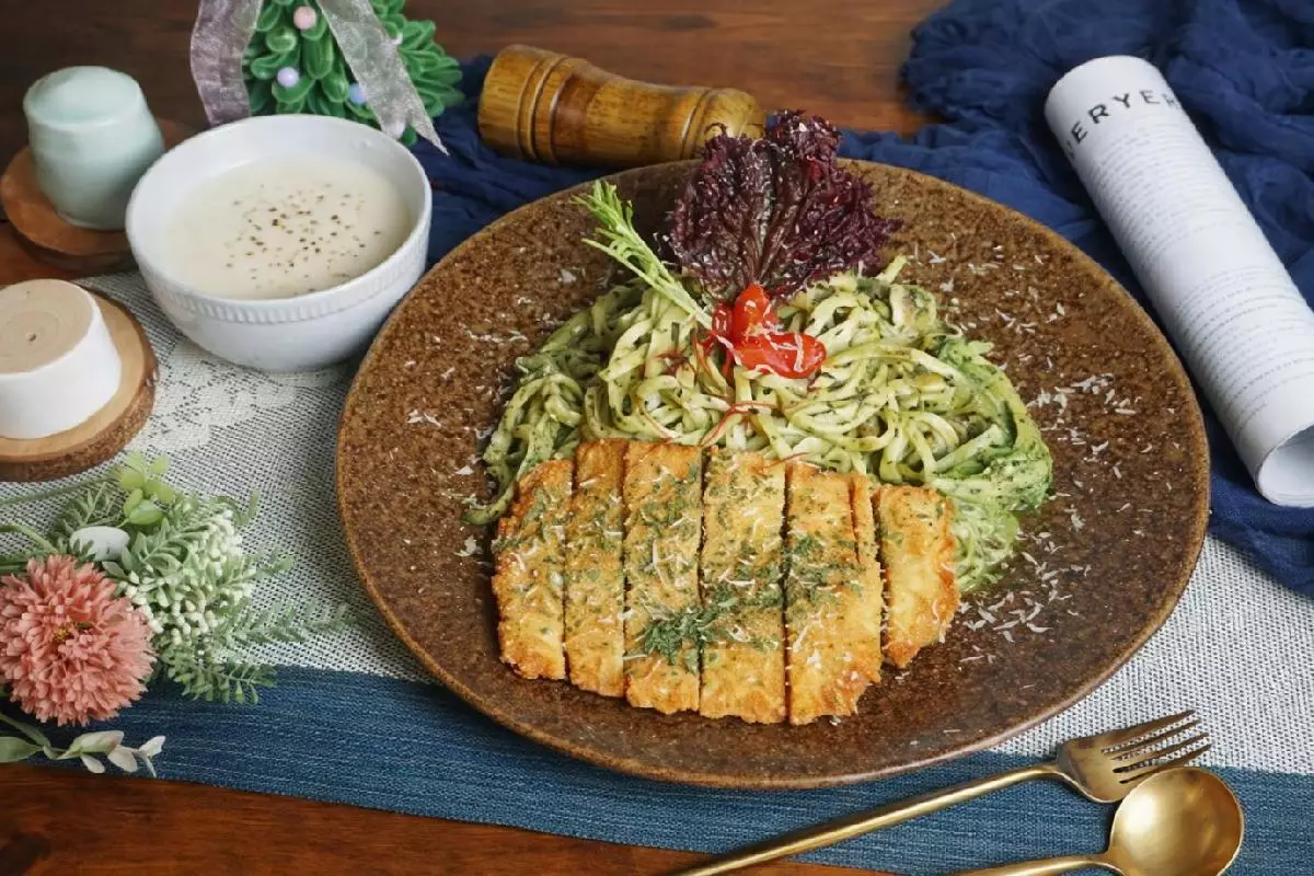 餐點主打義大利麵與燉飯,麵條特別選用口感更佳的扁麵,並提供不同醬底與主食搭配,讓顧客可依口味偏好自由調整。菜單中最受歡迎的選項之一是「青醬炸雞腿義大利麵/燉飯」,售價 $269 元,此外也有炸豬排、鮮蝦等變化搭配,價格約介於 $239 至 $289 元之間,選項豐富,亦提供葷素兩類主餐。