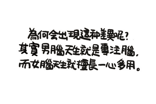 ﹡在下我小小的看法是,其實上面證實的這個情況,是可以從平常生活中得知的。有時候在跟男性朋友講話的時候,總是會覺得為什麼我在講話,你都沒在聽?多少都會感到有點不愉悅的感覺存在。但是看了這篇報導之後,多少會覺得沒有那麼的不愉悅,只是還是希望能夠想辦法分點注意力來聽別人講話比較好。