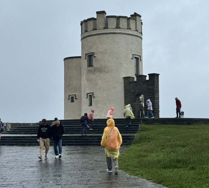 | 1835年修建,奧布萊恩塔(OBrien tower),是斷崖至高點,上去需另外購票。奧布萊恩塔位於莫赫懸崖邊緣的景觀塔,遊客可從塔頂俯瞰海浪與皺褶般懸崖景色。空間小小的,一次只允許15人上塔,排隊登上塔,天氣非常惡劣,風雨交加,大西洋被濃霧遮蔽,懸崖只露出與海面接觸下段一小部分,塔上無遮風蔽雨處,又濕又冷,趕緊離開,這種天氣,哪能看見斷崖壯麗美姿。 |