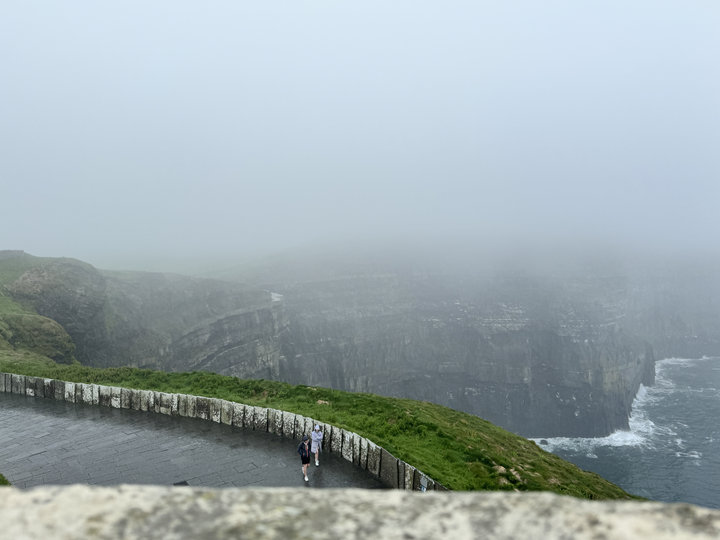 人算不如天算,沒下幾次雨,有下也是短暫,不一會兒就放晴,哪知,遊程接近尾聲前往,是期待已久,我最深、最深、最深的莫赫懸崖(Cliff of Moher),一早,大雨就毫不留情,沒完沒了下個不停,巴士啟動一路,還相信天一定會放晴。到達莫赫懸崖,雨更大,風更強,在寒風刺骨,瑟瑟發抖中走向懸崖沿路還抱著一絲希望,現在不只雨大風強勁,另一個出來助陣鬧場的是伸手不見五指的大濃霧,蒸騰的霧氣,毫不保留,把整個斷崖及步道給密閉封蓋了,慘不忍睹的畫面,讓我完全崩潰。這也是大自然的傑作嗎?!