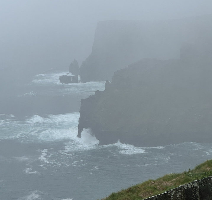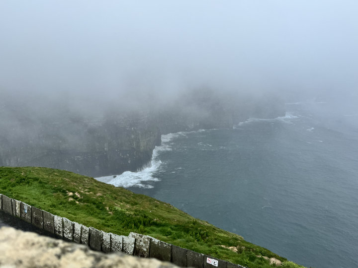 濃霧大雨中步道完全看不見,返回時在岔路上,因霧濃走錯方向,幸好遇到友伴,不然會被濃霧牽引到回不了車。願望沒達成,雖然只見披得厚實白紗,一片朦朧的崖壁;與拍打崖岸陣陣洶湧的波濤。但,還是讓我稍稍介紹愛爾蘭聞名的莫赫懸崖。
