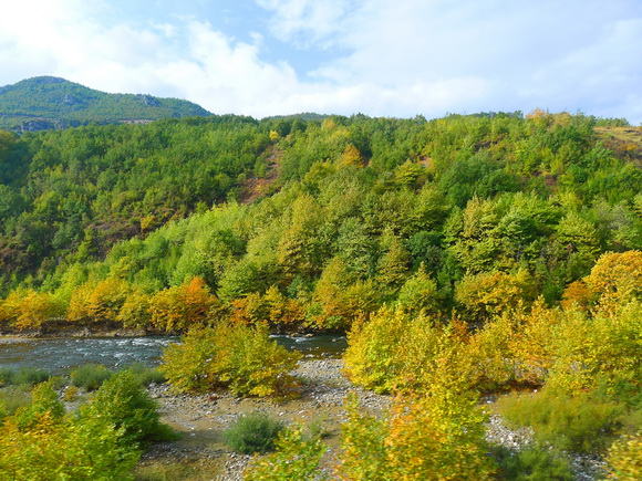 出境阿爾巴尼亞,入境馬其頓,巴士依然在巴爾幹山嶺迂迴盤旋。秋染黃了溪谷漂亮極了。