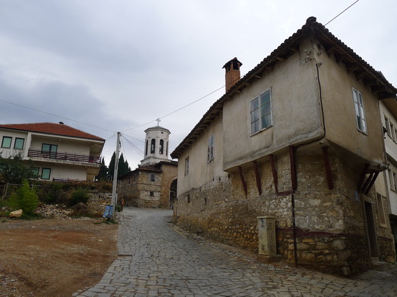 步出教堂往一旁的撒母耳要塞走去,撒母耳要塞是馬其頓保存最完整的要塞之一。 西元976到1014年,馬其頓還是保加利亞屬地時,由保加利亞皇帝Samuel下令修建。1395年,被鄂圖曼土耳其佔領,一度成了馬其頓東正教徒的囚禁地。長達3公里的城牆,幾乎佔據了古城的整座山頂,城牆四周築有塔樓和突出城垛。城牆外有古舊石階讓遊人豋城,不過大部分遊客都利用城內的鐵梯登上城頂。我們一樣從鐵梯登城,戰戰兢兢走在狹窄城牆上,深恐一陣風來,人就被吹落城底。舉目四望,要塞城牆維護得宜,保存完好,但塞內的古建築都已傾圮四敗。立於堡頂,古城的湖光山色是一覽無遺。將視線拉回要塞,一面巨幅馬其頓國旗迎風高颺。再怎麼誘人的美景,也抵不過徹骨冰涼的颯颯秋風,僵硬著身子步下城牆,躲入丘坡房舍密集的小巷。巷子兩旁隨坡修築的屋舍,長相怪異,底層的1樓以大小不一的石塊堆砌,2樓則用木頭建蓋,瘦窄的1樓挺著寬闊的2樓建築面積,2樓寬出部分的屋牆,以幾根浮懸木頭斜撐,有頭重腳輕的突兀,有一推即倒的驚覺。