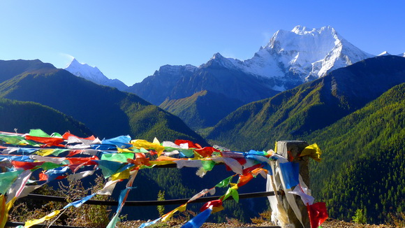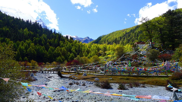沖古草壩前石灘上的風馬旗隨風翻揚,遠方的夏諾多吉神山在微笑。
