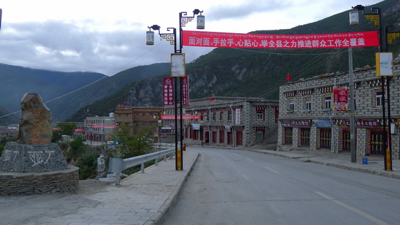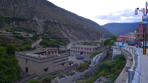 當晚10點我們抵達日瓦算是早的,一直到深夜遊客還陸陸續續入住。日瓦海拔2980公尺比理塘及稻城低,又處在群山環困的山坳中,氣候溫暖,遊客較能適應,距離亞丁景區也只有34公里,不但可以減輕長時間的舟車勞頓,停留景區時間也更多。當然囉!若住在與景區僅幾步之隔的亞丁村更方便,不過亞丁村食宿條件極差,海拔3900公尺也高過稻城,都是攝影者或爭時間登牛奶海與五色海遊客的選擇。頂著濃冽的晨風步出旅館,雖然海拔不到3000公尺,但是走起路來依然有苦役般的難受。僅住400多戶人家的日瓦村,一條亂石密布的赤土河深深切割兩岸對峙的群山,村子就懸在山的半壁上。『日瓦』藏語意『亂石溝尾』,於2001年改名為『香格里拉村』了。村子街道一邊是依山而建整齊劃一藏式的新建築,有旅館、飯店、紀念品店和各式商家,另一邊是赤土河谷。立於街心遠眺山腰零星散落的藏式石寨,民寨商家分立兩岸是壁壘分明。清晨商店雖然未開,但也嗅到了濃濃的錢滋味,大陸生僻山中景區都是如此,只是商機剛起步的日瓦,追錢的步調還在生澀學習與觀察嘗試中,所以尚存著幾許良善的人情味,但能保持多久誰也說不準。