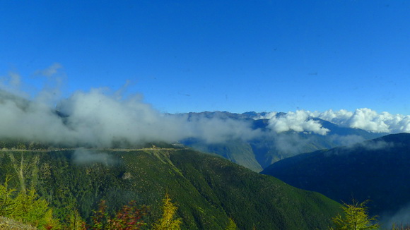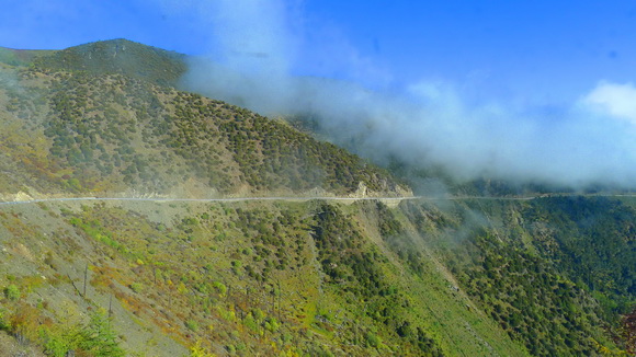 早晨的霧氣瀰漫日瓦到亞丁的盤山公路上,太陽出來後晨霧很快就消失了。