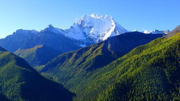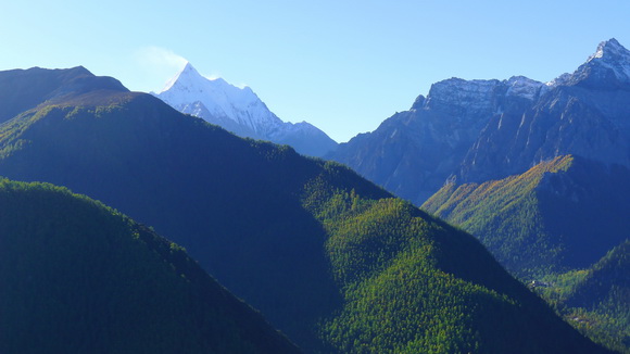 不久,仁村出現在谷豁向陽平壩山腰,古樸無華的藏寨星星點點零散在層層梯田間,秋收過後枯乾黃褐的色彩雖不炫麗,但它倚著大山,踩著溪河,一圈圈如遊蛇彎繞的盤山公路纏繞,奇特靈秀醒目極了。不會有山遮雲罩的仁村,時時陽光普照,以光影著稱是攝影家鏡頭追逐的唯美畫面。公路旁一座觀景台是攝影家定格,遊客俯瞰仁村的最佳處。一塊小小的苦寂平壩,不食人間煙火有多久?!幾間參差石塊堆砌的蒼老建築、幾道人畜走出的彎泥路、幾支分岔湍湍川流的小河,看不到朝代歷史的更迭,滄海桑田的幻化,今夕何夕?!讓人錯亂了年代,仁村的沒開發好像就是開發?!初出茅廬的導遊,情緒管理欠佳的領隊,並未解說讓大家下車,只能在車內匆匆空留望。巴士馬不停蹄依舊在如魚背脊的峰巒疊嶂,霾霧滃郁間一山盤過一山,望向前方,彷彿就要繞出群山,但又走不出去。仁村隨著車轉山繞,隱隱現現消失在群峰中。白雪覆蓋的仙乃日神山,正撥開雲層衝出萬巒拔向藍天掙著出頭,車追著仙乃日神山努力打轉,捨不得眨眼的大家,瞪大眼睛追尋那忽隱忽現神山的身影驚呼歡叫。當群峰都在腳底下的一個大拐彎,無雲無霧,蔚藍天際仙乃日神山霎時映入眼簾。