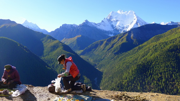 高原崖邊上的藏族小販與身後的仙乃日神山及左側突出尖頂的夏諾多吉神山。