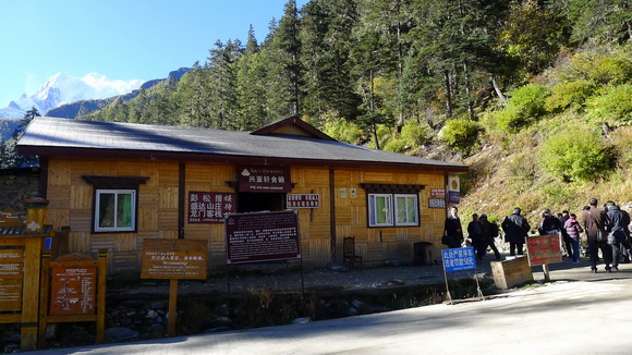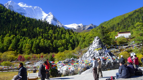 車子翻下谷地村中,只聞幾聲狗吠、幾隻黑豬賽跑、幾頭牦牛覓食、幾名孩童張望、幾位藏婦種菜,不到一分鐘,亞丁村就被拋於車後。亞丁村距離亞丁景區入口只有7公里,約20分鐘車程,專程前來攝影與背包客最愛選擇於此投宿。車終於止於龍同壩的停車場,開始了雙腳和2段的電瓶車的旅程。大陸十、一國定長假剛過,遊客銳減很快地登上由龍同壩開出的電瓶車,天呀!是結了冰的座椅,人在猶豫尚未坐定,車子就歪歪扭扭往扎灌崩全速跳蹦,幸好距離扎灌崩只有短短2公里,不然坐在結了冰的椅子上,行在坎坷顛簸山徑石道,屁股不凍結,骨頭不飛散那才怪呢!『扎灌崩』藏語意『大山崖的尾端』。下車後開始步行,步道雖然修得平坦,但走在海拔3850公尺的高地,每一步都是辛苦的。密匝匝的原始森林,白雪封頂的仙乃日神山一直迎在眼前、谷澗溪水一路潺潺相隨、斑斕秋林沿途低吟、河谷林梢五色經幡隨風翻揚、砌高瑪尼堆祈福石從不間斷、………沉靜安詳得讓人忘了缺氧的不適,結束500公尺兩壁挾峙的山路,氣喘吁吁走到了沖古草壩旅客休息站。
